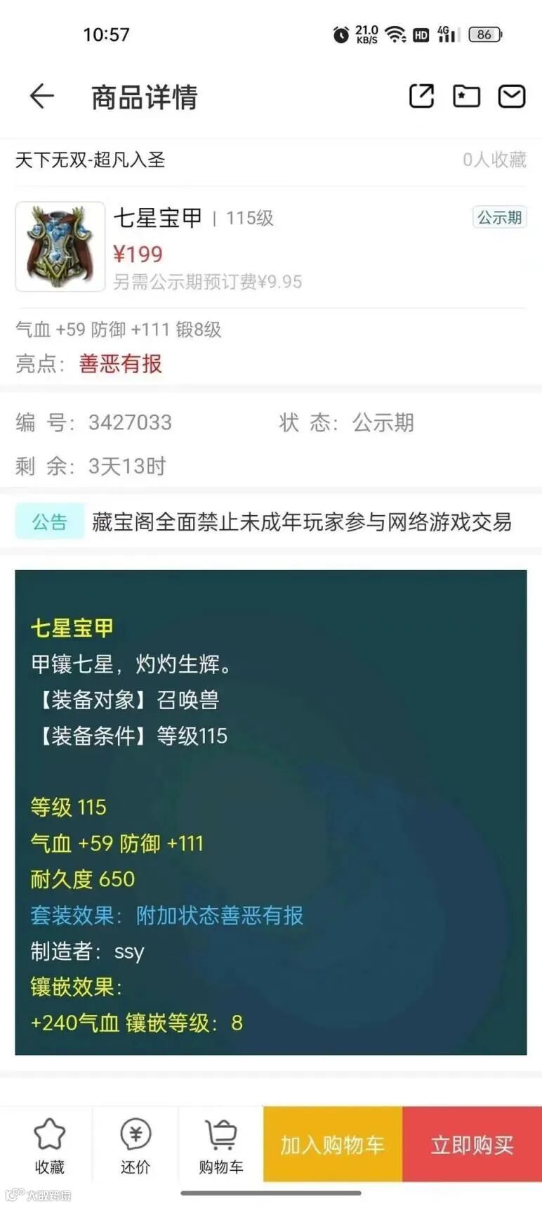 近日,天下无双-超凡入圣服务器藏宝阁上架了一件召唤兽装备。这是一件115级,气血59点、防御111点的善恶装备。值得一提的是,这件装备居然镶嵌了了8级气血灵石,灵石价格已经远超装备本身的价值,所以这波肯定有“盲僧”中过招了。