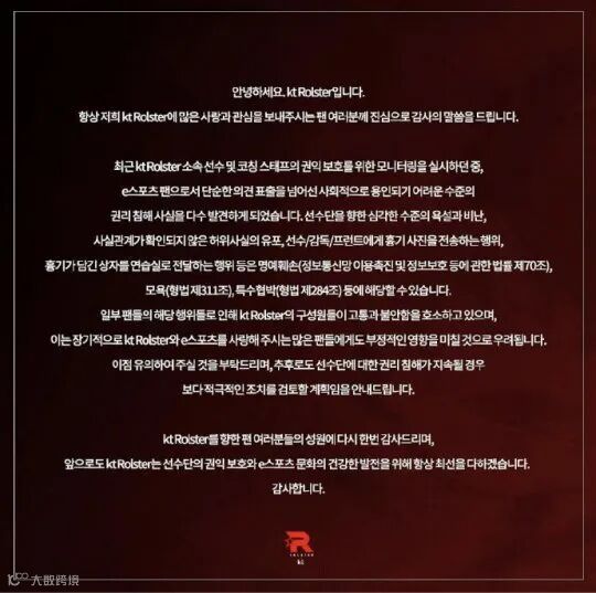 KT战队对此事极为重视,明确表示这种行为触及了名誉毁损、侮辱以及特殊胁迫。如果这样的事情再发生,他们将会采取进一步的措施,保证队内人员的权益。