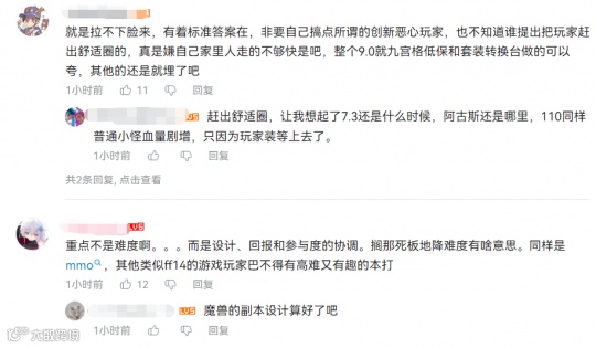 换言之,高难副本的时代,将会不再存在,玩家们都有挑战M本尾王的机会。对此玩家表示:“就是拉不下脸来,有着标准答案在,非要自己搞点所谓的创新恶心玩家,也不知道谁提出把玩家赶出舒适圈的”,“让我想起了7.3还是什么时候,阿古斯还是哪里,110同样普通小怪血量剧增,只因为玩家装等上去了”,“重点不是难度啊,而是设计、回报和参与度的协调”……