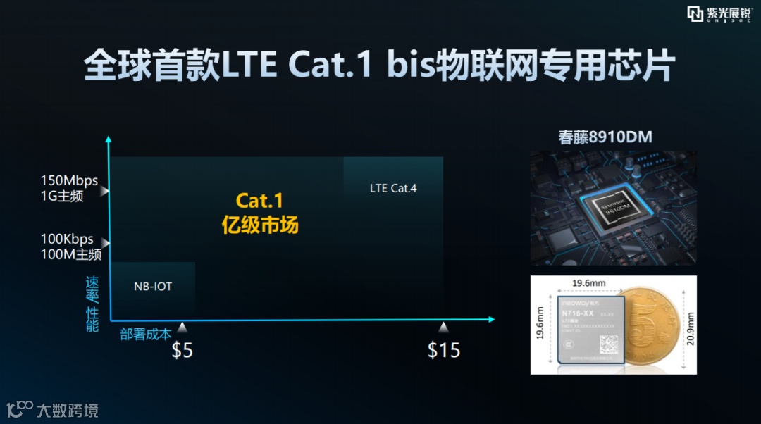 除了5G相关技术的不断创新突破,展锐还发掘了一个非常庞大的市场——LTE cat.1。传统物联网使用NB-IoT针对极低速的使用场景,却没法支持语音应用。而LTE cat.4是成本稍微高一点的解决方案,但也难以大幅覆盖更多使用场景。展锐主导并推动了Cat.1bis领域技术标准,既能够提供如POS机,车载,共享单车等低速的数据业务,还可以提供语音业务以够满足端侧规模化量产成本的诉求。目前,这一市场达到每年至少亿级出货量,展锐凭借全球首款Cat.1bis芯片8910DM,实现 Cat.1bis市占率全球第一,占比70%。
