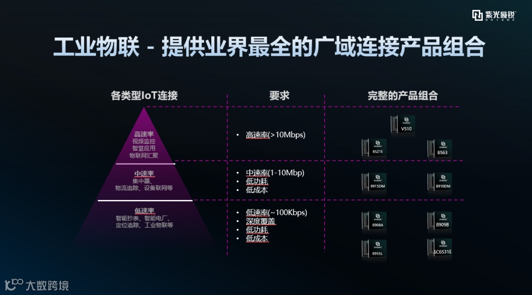 夏晓菲表示:“物联网连接是工业革新的基础,从整个物联网产品来看,从高速5G到中速的LT cat-1到最低速的NB-IoT,展锐已经完成了全系列产品覆盖。”