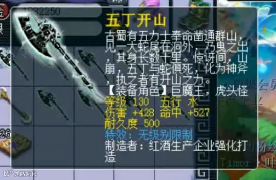 这是把130斧头,初伤603,虽然属性爆的不多也没有双加,不过带上梦想蓝字,这价格绝对低不了。而且造型也是加分项,五丁开山特效炫酷,是无级别斧头中的巅峰款式。加上制造者也是号主本人签名,所以带上这把武器,身份和牌面绝对有了。