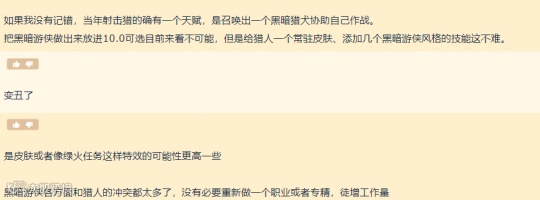 对此网友的反应倒是十分淡定,“如果我没有记错,当年射击猎的确有一个天赋,是召唤出一个黑暗猎犬协助自己作战。把黑暗游侠做出来放进10.0可选目前来看不可能,但是给猎人一个常驻皮肤、添加几个黑暗游侠风格的技能这不难。”,“访谈都说了,黑暗游侠未来有机会做成新外观,什么新职业新专精新皮肤就不要妄想了”,“大胆一点猎人的第四专精:黑暗游侠,完成一系列的任务后开启第四专精。”……