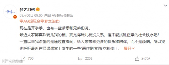 课堂,终归是教书育人的严肃场所。尽管上网课相较于平时少了许多约束、没有那么拘谨,但这并不意味着大家就能为所欲为。如梦泪本人所说,他可以接受大家玩梗,即便是带有戏谑之意的。却不能接受自己是以扰乱网课秩序的形象,来被更多人所知晓。
