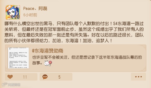特别的事情其实有蛮多的,对我个人而言,比较深刻的是每次重大赛事前,我总能收到一些“陌生玩家”的鼓励和支持,区内帮派、玩家朋友和跨服的粉丝朋友给了我们很多留言点赞,这一点让我备受鼓舞,可以说没有他们,东海湾的战神都很难拿满。
