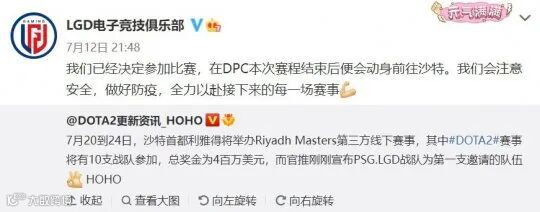 昨日晚间,LGD官博向外界透露:“我们已经决定参加比赛,在DPC本次赛程结束后便会动身前往沙特。”