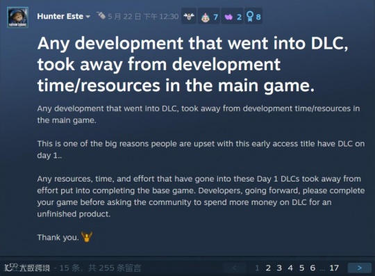 并且DLC对于游戏内容的加成有限,其本身不过是装饰类物品,这个问题在Steam社区招致了玩家们的热议。一部分人认为主创们“不务正业”,在游戏本体还不够完善的情况下,就开始推出付费DLC。