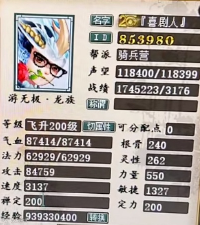 偶然间发现一位超级大龙!这位龙族来自云山梦忆服务器,他采用了6666仙器配置,带6级藕丝,攻击8.5万,速度更是超过3100!