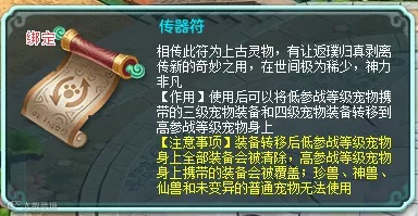 最后就是新增两个道具了,一个是传器符:使用后可将低参战等级宠物携带的三级宠物装备和四级宠物装备转移到高参战等级宠物身上;