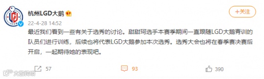 “最近我们看到一些有关于选秀的讨论,甜甜珂选手本赛季期间一直跟随LGD大鹅青训的队员们进行训练,后续也将代表LGD大鹅参加本次选秀。选秀大会也将在春季赛决赛后开启,一起期待她的表现吧。”