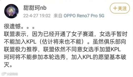 当前,她在王者荣耀战队LGD大鹅已经试训了三个月,不日就将参与选秀大赛。可最近两天,网上突然出现了许多爆料信息,称甜甜珂因为女选手的身份,被禁止参与KPL选秀大会。至于“官方”给出的理由,则是已经开通了女子赛道。