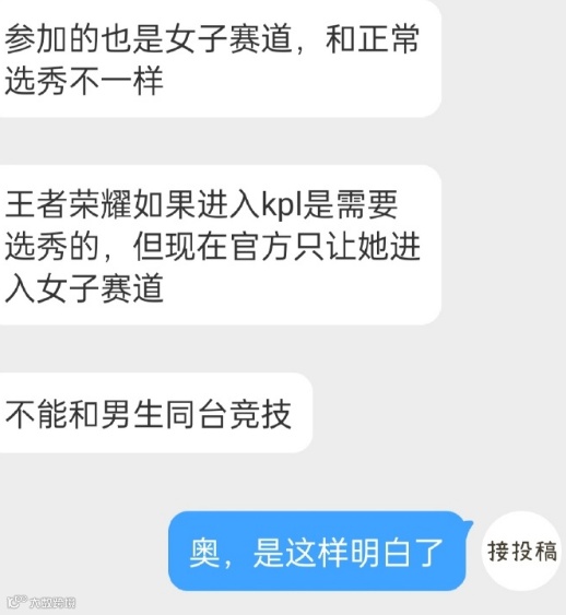 远到《星际争霸》项目的女帝Tossgirl,近到巴西赛区的Mayumi,都曾在顶级联赛中参加过正式比赛。对事不对人,KPL联赛从未有明文规定不允许女选手参赛。如果对方具备参加顶级联赛的实力,那么即便是官方也没有理由拒绝。