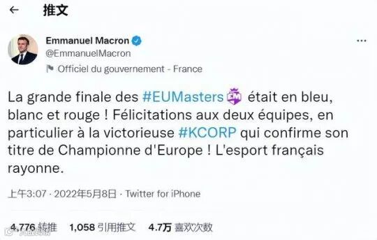 尽管Rekkles常规赛打得磕磕绊绊,但最终还是带领KC战队打进了春季的欧洲大师赛,并拿下了冠军。当时法国总统马克龙,甚至都在推特上发来了贺电。