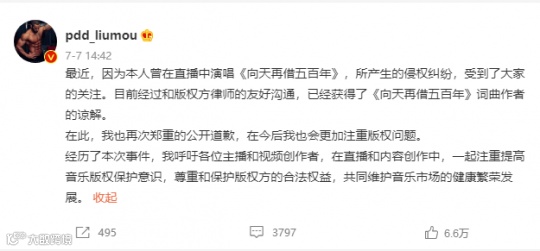虽说这件事本身听起来相当魔幻,但对方其实是有倚仗的。不得已,PDD最终只能在网上向原曲作者发起了郑重道歉,并表示:“我以后不会随便唱歌了,也告诉大家,直播属于商业范畴,唱歌之前一定要获得著作权人的许可。”