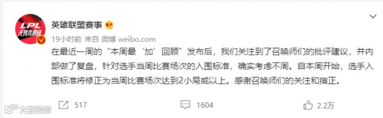 而在昨日,英雄联盟赛事官方终于对这件事予以了回应,承认了确实有考虑不周的地方。从本周开始最“加”选手的入围标准,将修正为当周比赛场次达到两小时以上的选手。