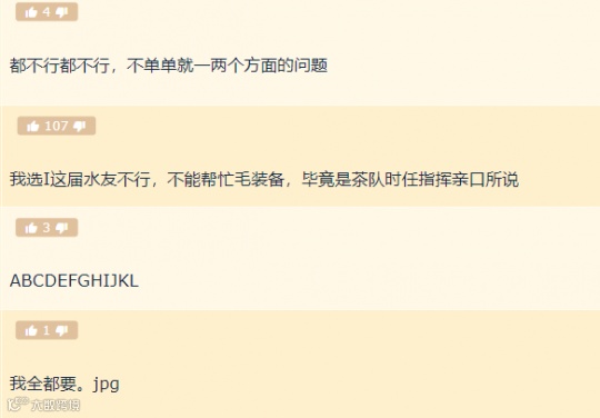 除了这些比较正常一点的评论之外,还有无厘头的网友神评论:“我认为是这届水友不行,不能帮忙毛装备,毕竟是茶队时任指挥亲口所说”,“就算茶队有1%的问题,难道水友没有99%的错?”,“拿着最高的薪水,呈现出最烂的表演,各种硬件配置都是国内最顶级,成绩烂得一塌糊涂”……
