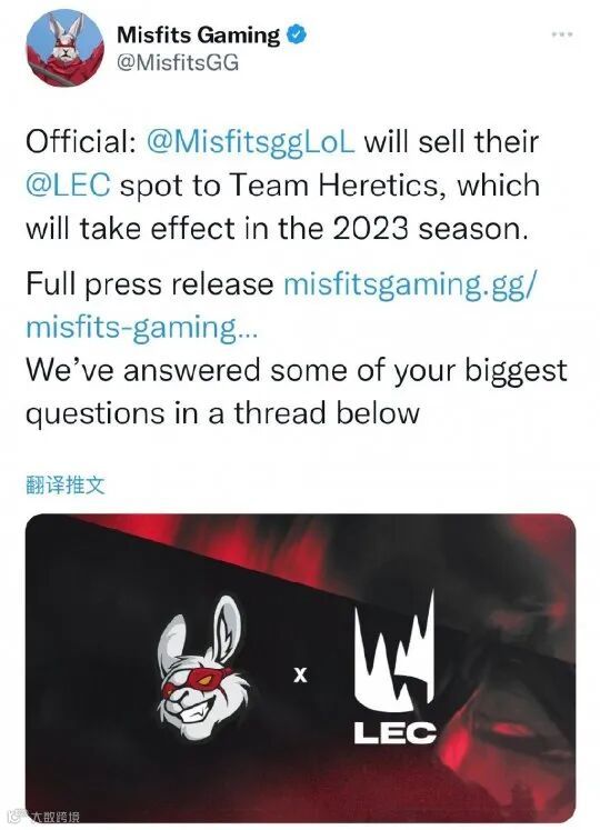 今天凌晨MSF的官推发布了一则公告:本赛季结束后将退出英雄联盟LEC联赛舞台,并将其位置出售给西班牙体育组织Team Heritics,Team Heritics将在2023年加入LEC。