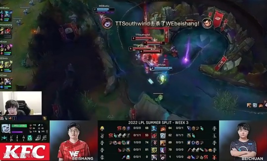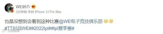 前WE上单957在二路关注了这场比赛的全程,事先粉丝们也都希望Xiye和SMLZ的再次联手,能够帮助队伍取得夏季赛首胜。可事与愿违,WE被TT打得毫无还手之力。打野悲伤的状态肉眼可见地下滑,WE的整体运营节奏也跟TT有着巨大差距。