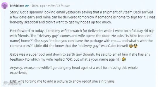事后看着照片上这个大腹便便的“快递员”,bitfiddler0肠子都悔青了。幸运的是,他还是收到了专属福利来慰藉内心——带G胖签名的Steam Deck掌机以及被免去的尾款。