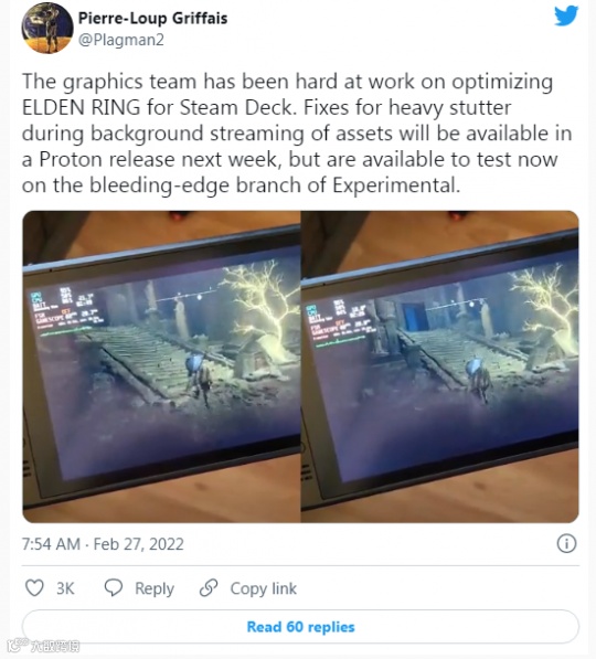 PC用户的体验很差,然而在另一边几乎跟《艾尔登法环》同期发布的Steam Deck掌机,为了凸显自己的高性能便以这款游戏为对象,实验了默认模式下的实机表现。大部分情况下游戏都能稳定45帧,特定场景会出现掉到30帧的情况。