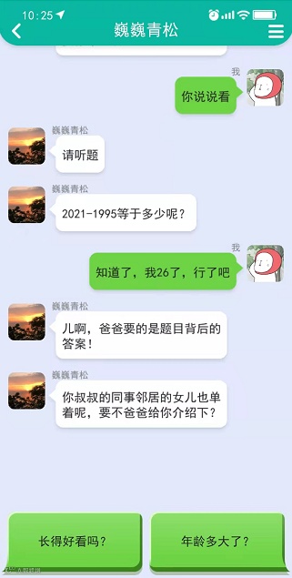 这个时候母亲的聊聊亮了,太真实了,上来就是单身狗嘲讽二连击,对于母亲的无情骚扰我还是选择了回避。很快父亲的聊聊也亮了,只能说不愧是亲爹,上来就想让我们给他买块玉,但是有失必有得,亲爹还是给我们搞来了一个妹子的联系方式,并且很快我们就开始聊天。