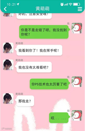 很快感情升温,任务提醒我们是该要照片跟出来见一面了。有了感情基础的我们要一张照片当然是轻轻松松的,当她问我要p过的还是没p过的时候,为了不让彼此的印象破灭,我还是选了p过的图,但没想到这将会是令我后悔的决定。见面当天,订了个400块的豪华网红餐厅,但一直没看见她的身影,打电话问她却说已经到了,但是对照完照片后,我默默起身,结束了这顿晚饭,都是自己选的。