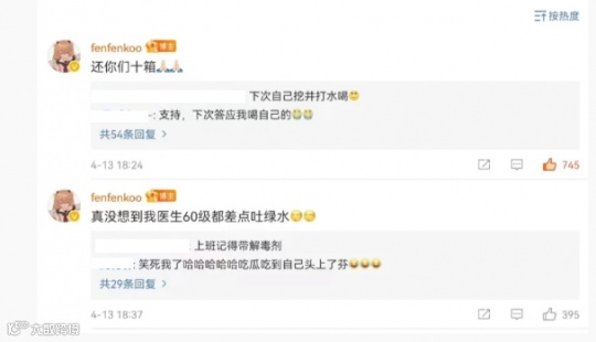 昨天晚些时候,fenfen在微博回应了这件事,并晒出了自己购买矿泉水的记录。随后还在评论区留言:“还你们十箱。”