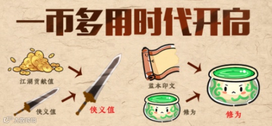 新赛季策划决定将货币系统精简,实现一币多用,即把江湖贡献值和侠义值合并为侠义值、监本和修为合并为修为,并且使用修为领悟秘籍时,不再消耗金币!