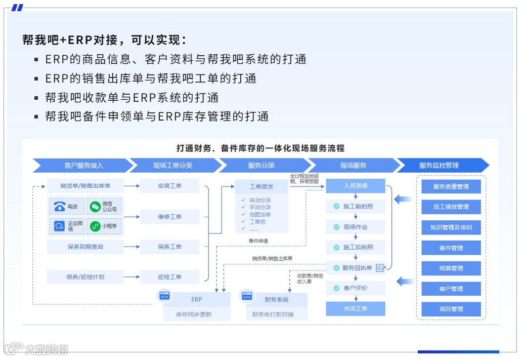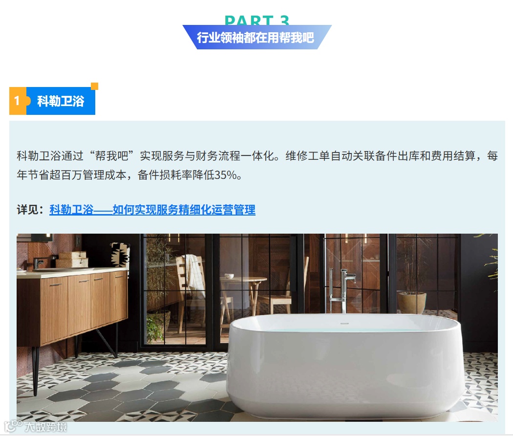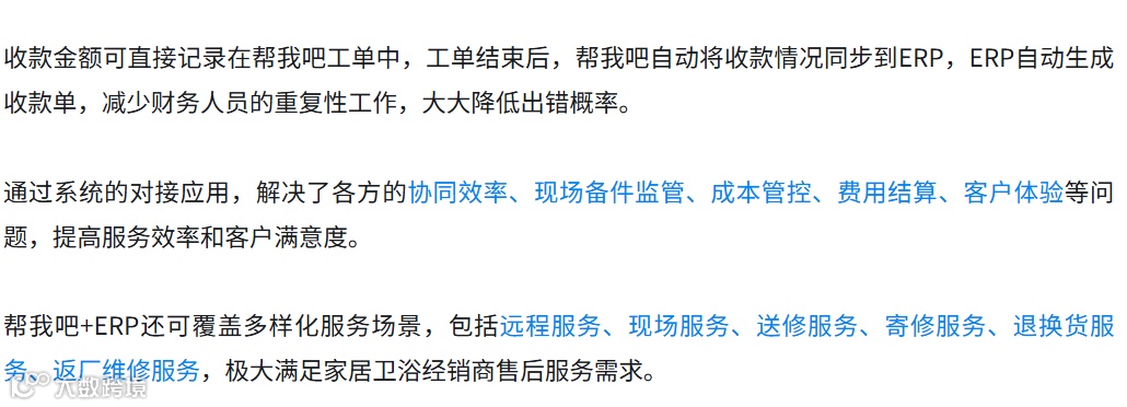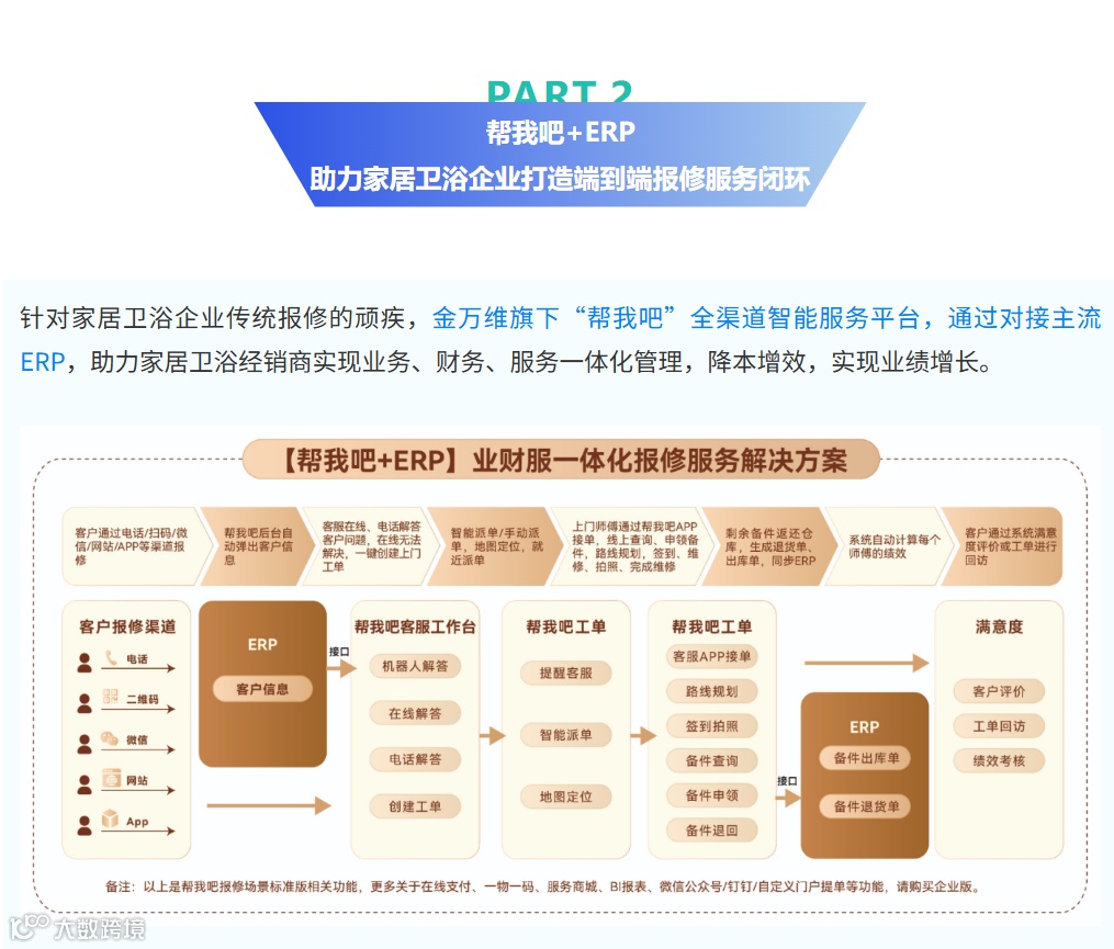 导读:针对家居卫浴企业传统报修的顽疾,金万维旗下“帮我吧”全渠道智能服务平台,通过对接主流ERP,助力家居卫浴经销商实现业务、财务、服务一体化管理,降本增效,实现业绩增长。