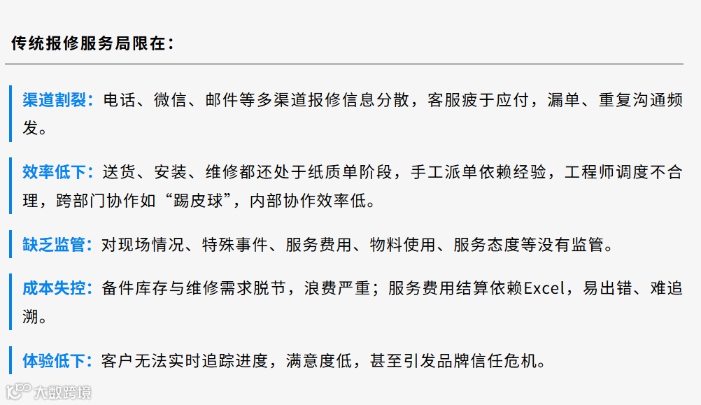 特别是在报修环节,电话打不通、工单流转慢、备件管理混乱、客户投诉不断……
