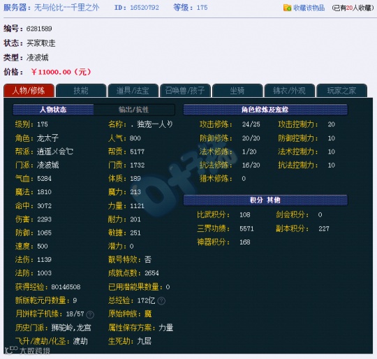 这是一个很普通的满级凌波城角色,有位玩家非常喜欢这号上的一只6技能三特殊野生雷龙,忍痛花1万1买下。