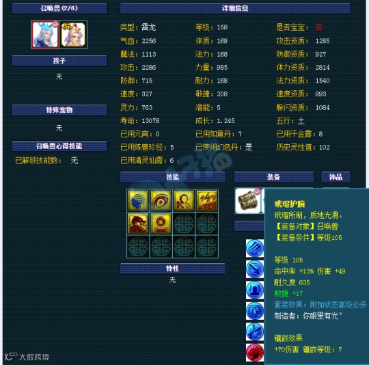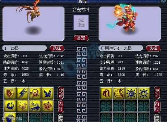 只有通过合宠,才可能得到更多技能或更加强大的召唤兽。少侠为了得到4特殊翻页雷鸟人,准备了一组9技能死亡法防雷鸟人+4技能净台凝光广目巡守(合成前雷鸟认证小法)。