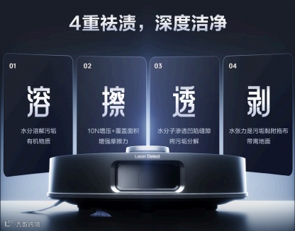 清洁的核心是“干净”,这一点海尔V3S直接拉满配置!搭载8400Pa超大吸力,堪比小型吸尘器,无论是孩子撒的饼干碎、宠物的细碎猫砂,还是地毯深处的灰尘,都能被轻松吸走,不留一点痕迹。拖地更惊艳!创新V型仿生拖设计,模拟人手擦地的发力轨迹,形成幕网式交叉顽渍剥离路线,来回擦拭实现4倍除顽渍效果。再加上10N增压拖地,厨房的油渍、客厅的酱渍、宝宝不小心打翻的奶渍,都能被彻底擦净,拖完的地板锃光瓦亮,光着脚走都没问题。