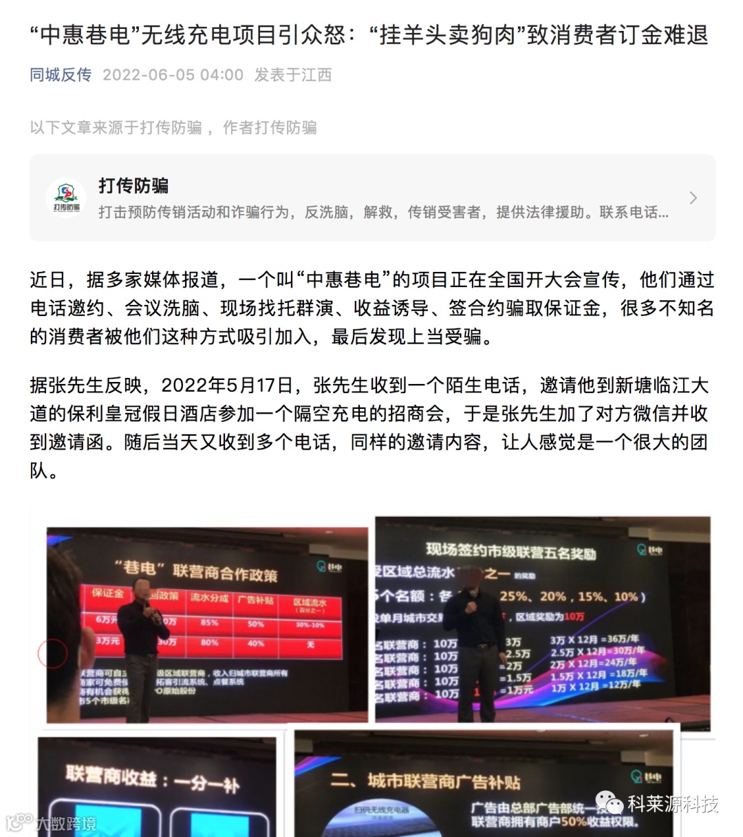 正是因为我们科莱源平台始终坚持以人为本、以用户为中心、客户至上的原则,坚持品牌营销、渠道建设和质量取胜的科学精神,我们最大限度保护了加盟商和品牌商户的利益,防止不良招商平台和马甲公司的不良侵权和侵蚀市场行为,为很多行业受骗者、上当者提供和协助他们维权的方法、工具与方案,最大的限度的降低这些受骗者上当者的经济损失,并进一步为他们提供心理的辅导和慰藉,帮助他们走出受骗的心理阴影,重新树立起对隔开无线充电行业和共享无线充电项目的信心,重新迈进5G时代就业加创业的新的时代行列。