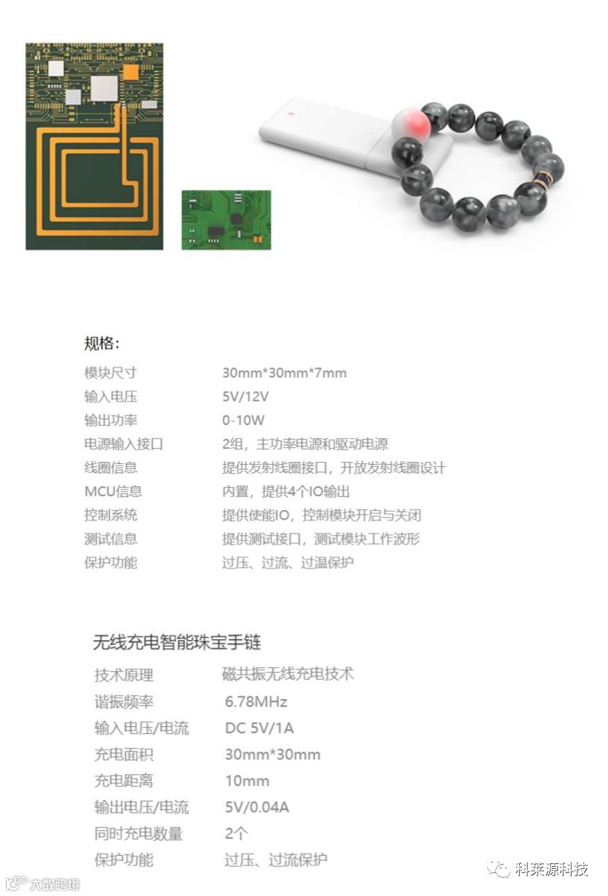 1. 无线充电智能珠宝手链: 功率为0.2W, 隔空充电距离为10mm。
