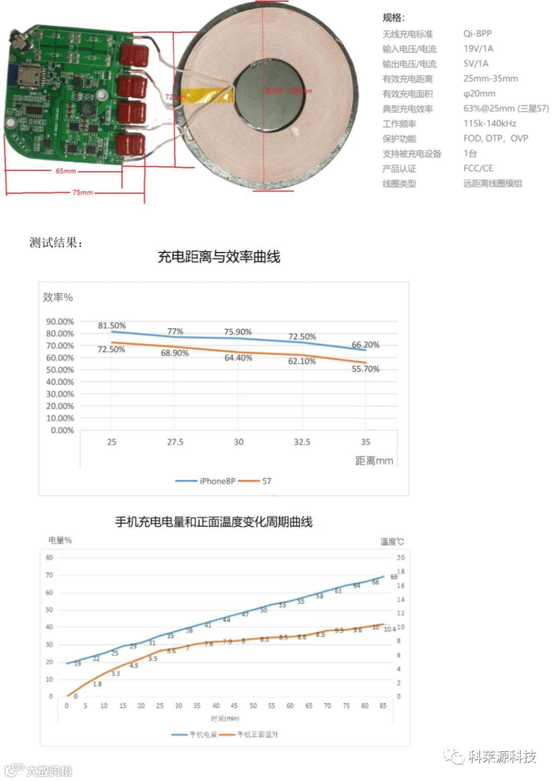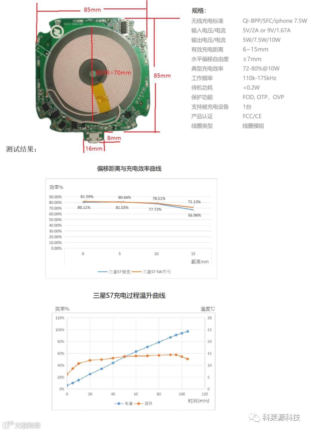 2、隔空距离6mm~15mm产品,功率为10W并兼容7.5W和5W。