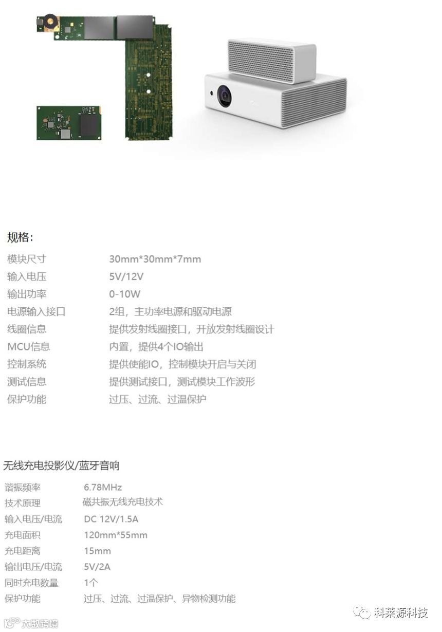 2. 无线充电投影仪/蓝牙音响:功率为10W,隔空充电距离为15mm。