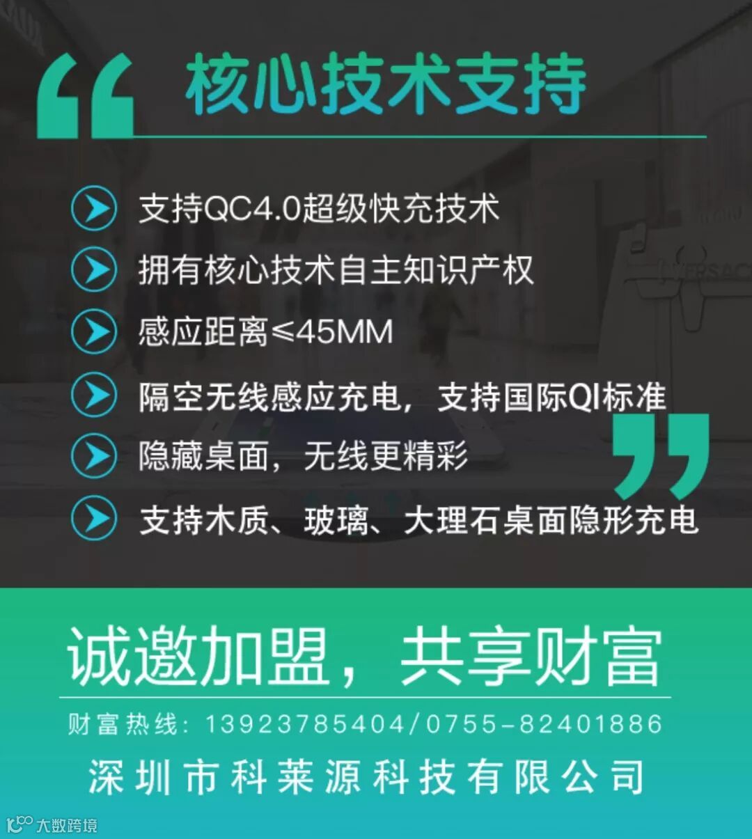 深圳市科莱源科技有限公司的诞生,为无线而生,为隐形充电而写,引领无线充电消费市场新标杆,打造未来无线生活馆!加入无线充电市场,深耕无线充电领域,迎接5G时代财富的风口,你准备好了么?