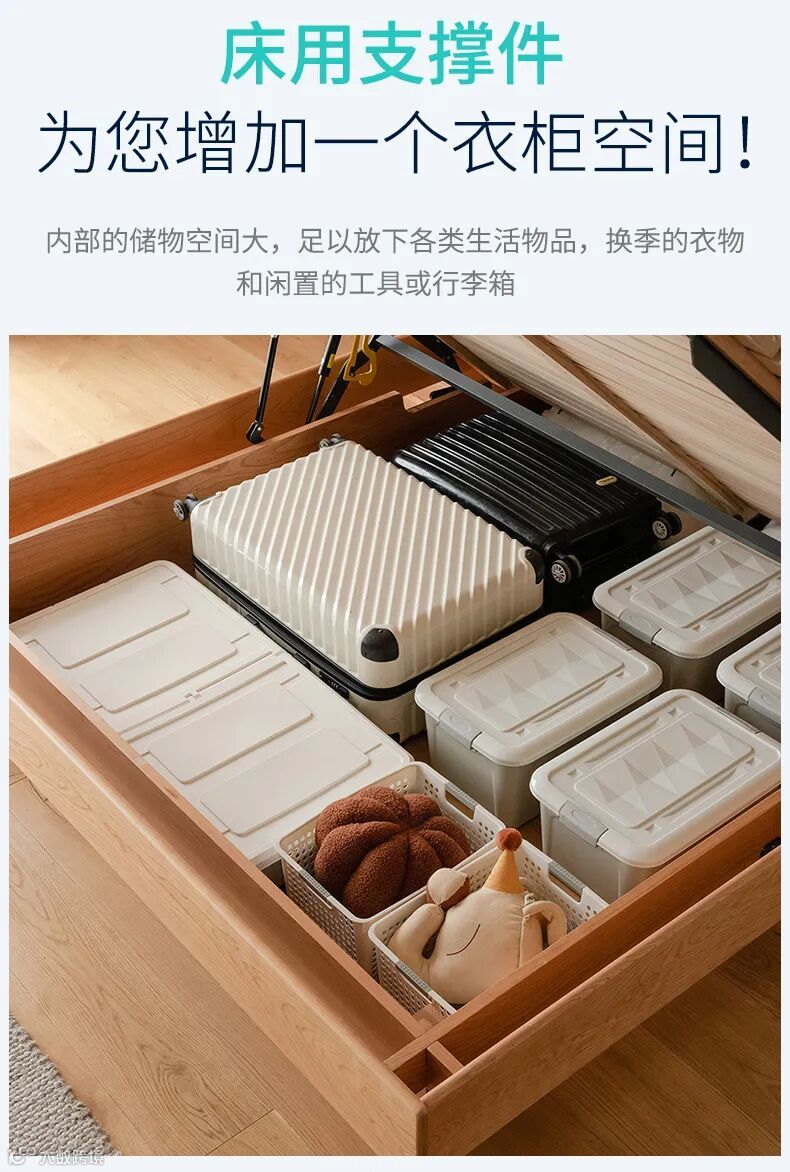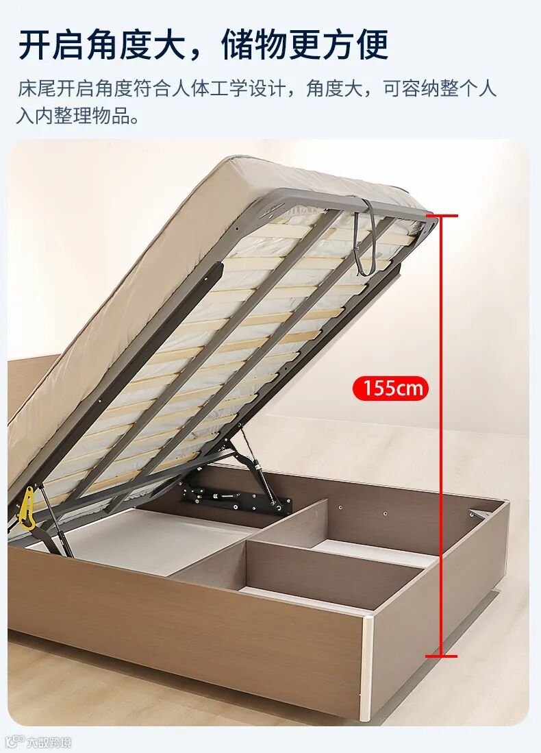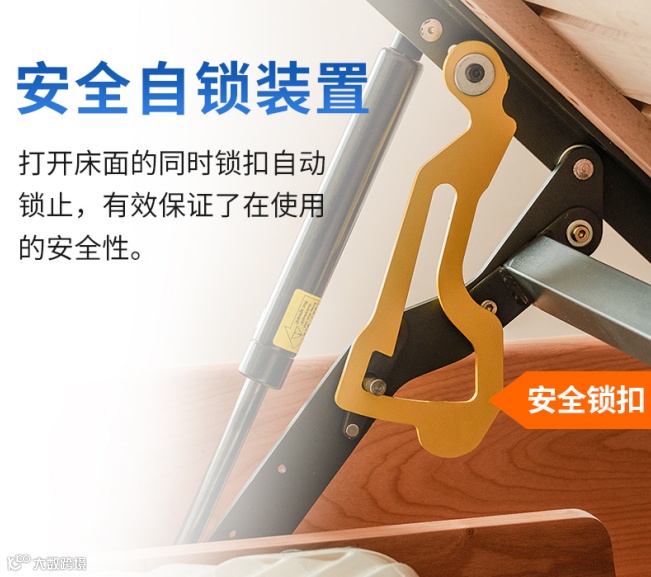 在安全这一块,我们必须想的周到!它不仅装配了气动支撑机构,同时还有自动上锁安全锁扣(此为专利产品),打开自动锁止,所以不用担心其打开时床架会掉下来或者晃动,给您充足的安全感~