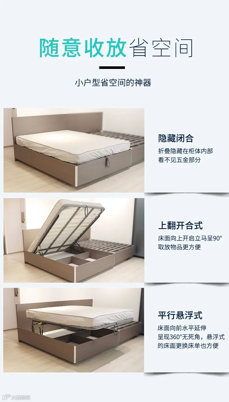对于小户型来说,平行床绝对适合!它相较于市面上其他款式进行了升级,能够将床抬起至平行状态,大大方便了清洁打扫,增添储物的功能!