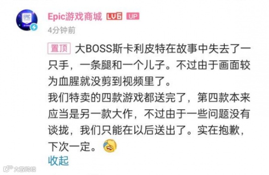 目前Epic已经了解到了这一情况,并很快做出了回应。Epic的官号运营向玩家们道歉的同时也透露,第四款免费送出的游戏按原计划,的确是一款大作。可是因为一些问题没有谈拢,所以才由《食人鲨》代替。