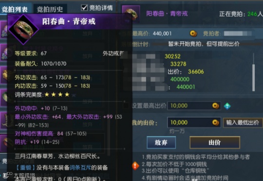 首先是这个67外功紫戒指,前面竞价还算平稳,都是最低出价,突然从3W铜钱蹦到了40W。这一手着实令人没想到,其他玩家心里都在偷笑,这大哥也太粗心了,看样子应该是想输入4W结果多打了一个0吧?!