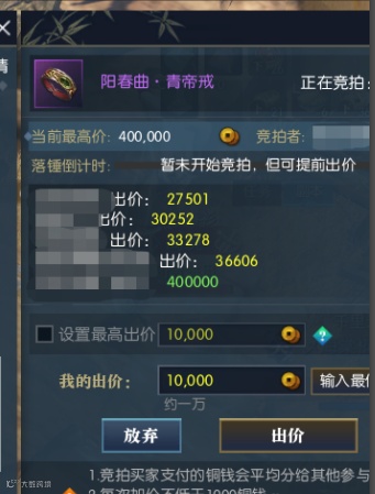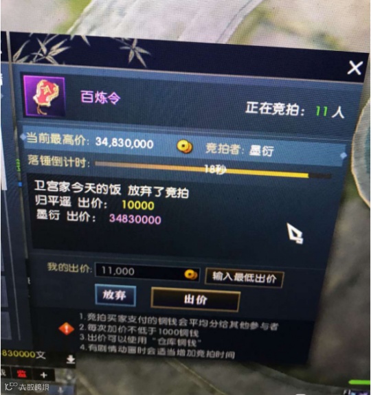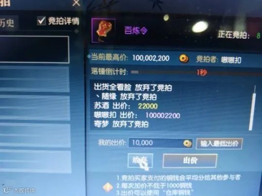 毕竟这一亿铜钱任何时候,买个几千块百炼令都没问题,如果说上面的案例是不小心多打了一个0、没注意价格就加价了,那么这位大哥从2W直接加到1亿,只能说是非常逆天了!