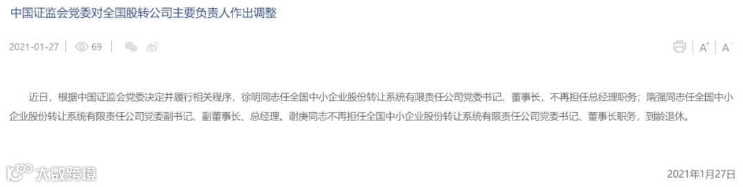 1月27日,股转公司公告称,根据中国证监会党委决定并履行相关程序,徐明任全国中小企业股份转让系统有限责任公司党委书记、董事长,不再担任总经理职务;隋强任全国中小企业股份转让系统有限责任公司党委副书记、副董事长、总经理。谢庚不再担任全国中小企业股份转让系统有限责任公司党委书记、董事长职务,到龄退休。