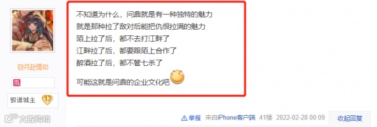 “击鼓咚咚咚”被玩成了一个梗,这多多少少有些嘲讽笑区长的意思,不过话说回来,鹬蚌相争渔翁得利,最开心的莫过于问鼎醉酒之外的帮派了。对于这件事,你是怎么看的呢?