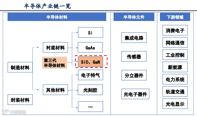 第三代半导体主要是SIC和GaN,第二代和第三代也称作化合物半导体,即两种元素组成的半导体材料,区别于硅/锗等单质半导体: