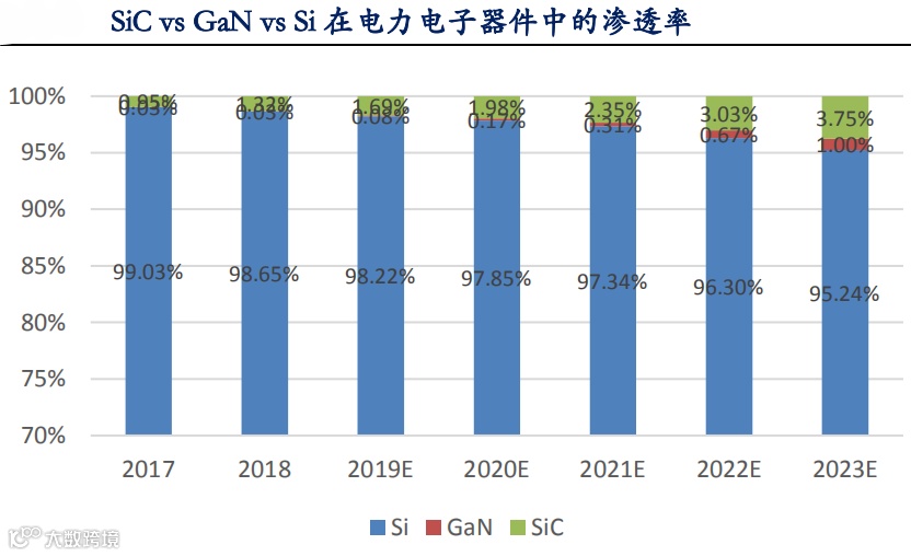 根据Yole预测,SIC和GaN电力电子器件(注意是GaN在电力电子中的应用,不包括在高频射频器件)2023年在整体功率器件渗透率分别为3.75%和1%;驱动因素是新能源汽车新能源发电以及快充。