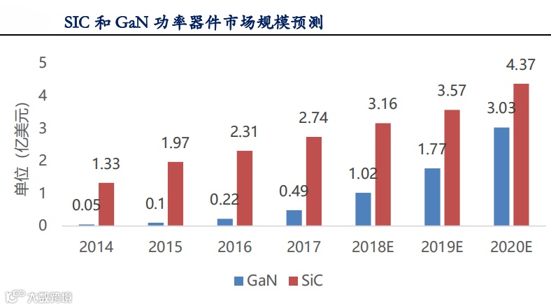 第三代半导体在功率器件领域的市场规模:(这里的GaN是用于功率器件)