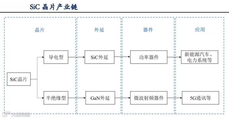 如前分析所述,碳化硅晶片主要用来做成高压功率器件和高频功率器件:SIC片主要分为两种类型:导电型的SIC晶片经过SIC外延后制作高压功率器件;半绝缘型的SIC晶片经过GaN外延后制5G射频器件(特别是PA);