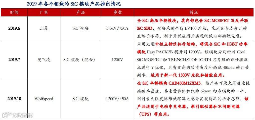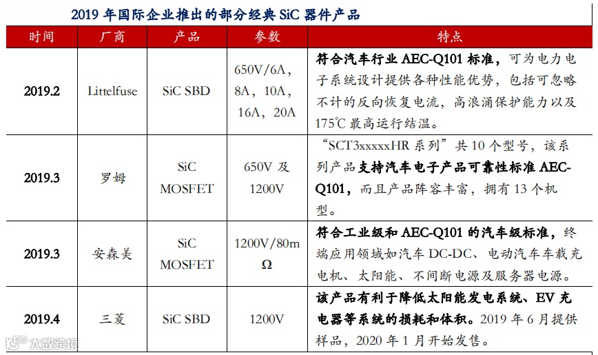 根据Cree提供的测算:将纯电动车BEV逆变器中的功率组件改成SIC时,大概可以减少整车功耗5%-10%;这样可以提升续航能力,或者减少动力电池成本。总结来说,SiC器件具备的多种优势将带动电动车续航能力的提升:•1)高电能转换效率:SiC属于宽能隙材料,击穿场强度大比Si基半导体材料更适用在高功率的应用场景;•2)高电能利用效率:SiC属于宽能隙材料,击穿场强度大比Si基半导体材料更适用在高功率的应用场景;•3)低无效热耗:开关频率高,速度快,所产生无效的热耗减少,使的电路、散热系统得以简化。2019年国际上的功率半导体巨头不断推出新的基于SIC材料的功率器件,且推出的几款SiC SBD及MOSFET均符合车规级(AEC-Q101)标准,这些产品应用于新能源车或者光伏领域等功率器件需求场景,将显著减少功耗,提高转化效率。